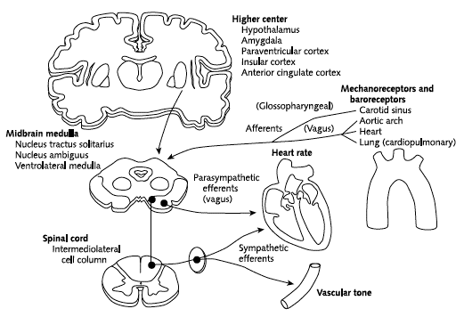 Pozitia ortostatica prelungita determina un grad de acumulare a singelui in extremitatile inferioare si scaderea volumului cardiac. Acest fenomen este accentuat la persoanele deshidratate, dupa exercitii fizice intense, transpiratii profuze sau restrictia lichidiana. Hipotensiunea arteriala rezultata este resimtita la nivelul baroreceptorilor din carotida iar fibrele aferente nervoase ale acestora declanseaza semnale autonome pentru a creste frecventa si contractilitatea cardiaca. Paradoxal receptorii presionali din peretele ventricular sting resimt stimulii care indica hiperpresiune si raspund prin bradicardie si scaderea contractilitatii, cu hipotensiune secundara brusca.